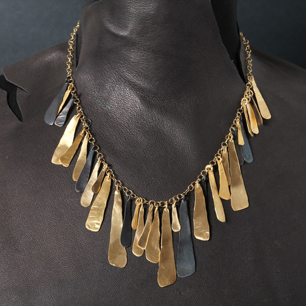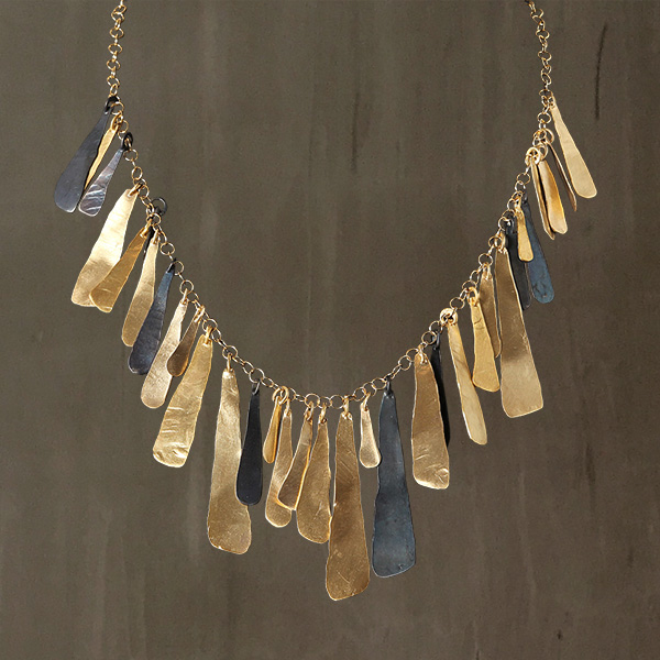Elegant two-tone necklace features hammered Bronze pieces which vary in size.