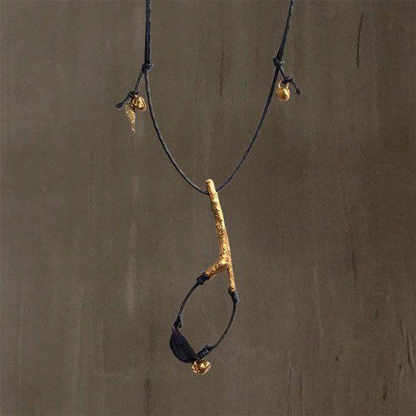Adjustable Black leather cord with a nature-inspired Y shape branch and a leather pouch. Branch is handcrafted from 24K Gold plated Bronze (width 0.5 cm/0.2 in)