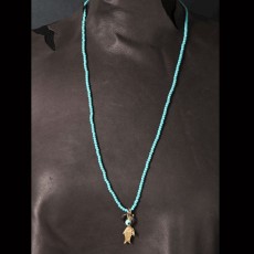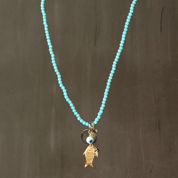Playful beaded handmade necklace with turquoise beads features a 24K Gold plated fish charm, a Black Rhodium plated ring,