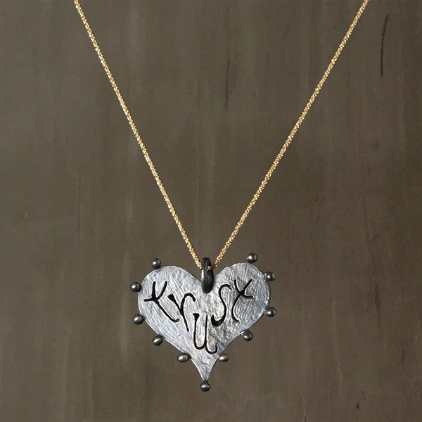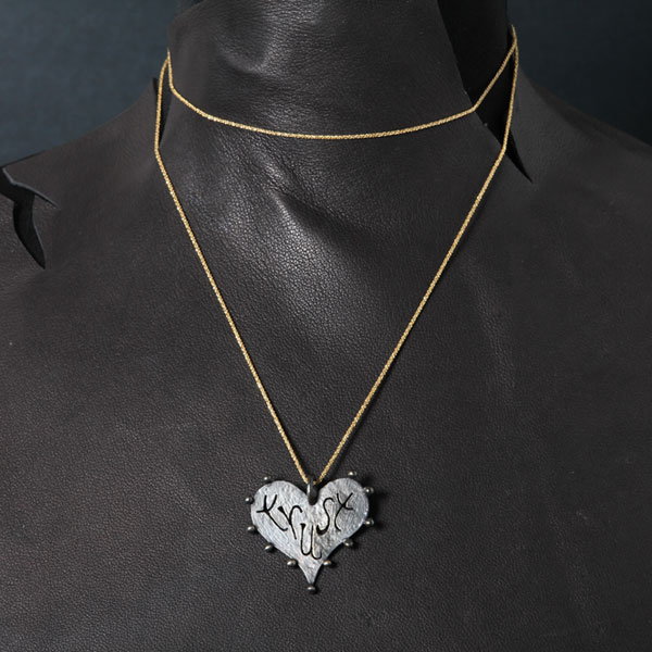 Black Rhodium plated hammered Bronze heart pendant with cut-out engraving of the word "Trust". Heart is dotted with tiny bubbles on the outer rim.
