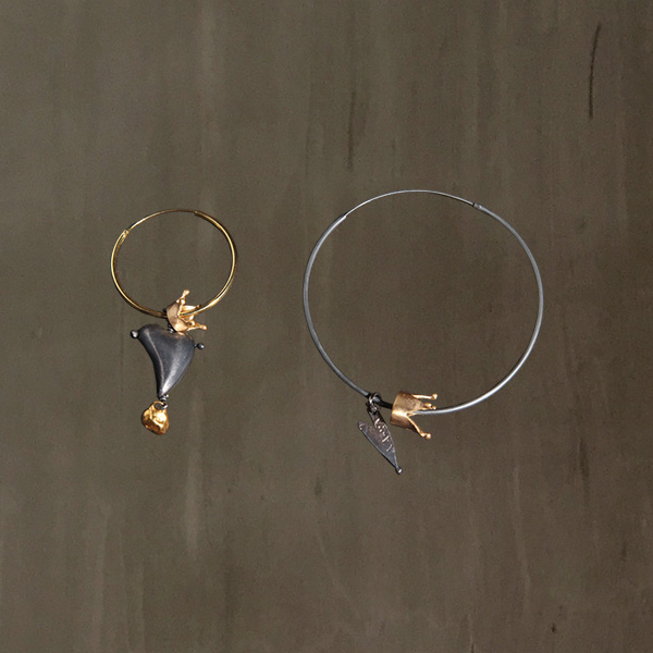 From both earrings hang a small 24K Gold plated Bronze crown. The smaller hoop features a 925 Sterling Silver heart with Black Rhodium plating.