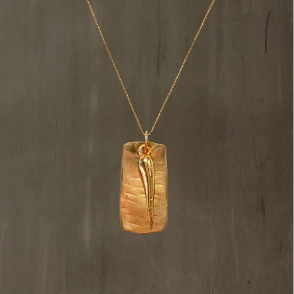 Spicy chili pepper charm lays over a rectangular plate with hammered texture. Both pieces are made with 24K Gold plated Bronze.