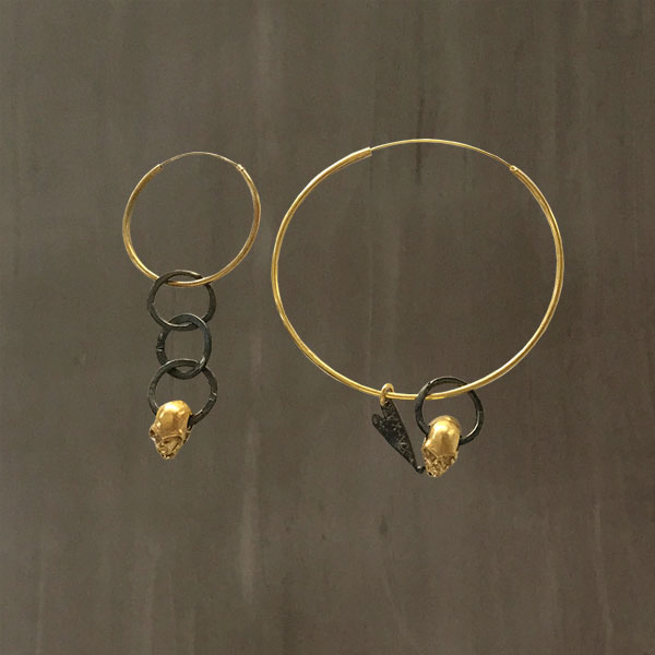 Two-tone asymmetrical hoop earrings 925 Sterling Silver with 24K Gold finish, feature Black Rhodium plated Bronze rings linked to 24K Gold plated skulls.