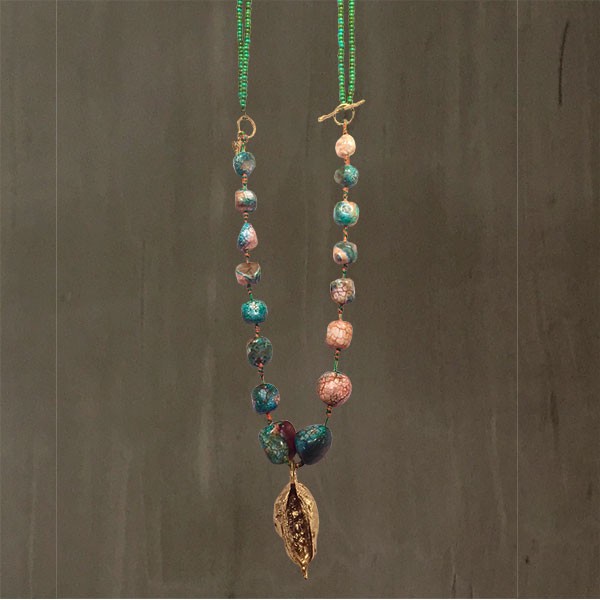 Beaded necklace with graduated Jade beads features as its centerpiece a handcrafted 24K Gold plated Bronze elm tree nutshell.