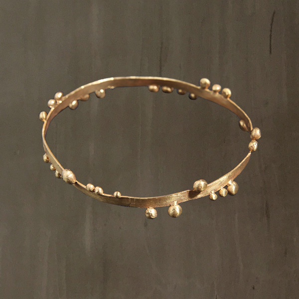 Lightweight bangle with bubbles on a flat outer rim, handmade from 24K Gold plated hammered Bronze.