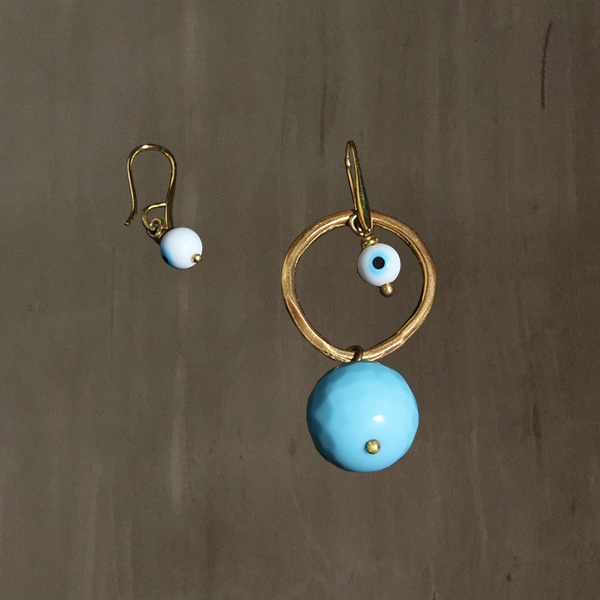 The large earring consists of a 24K Gold plated hammered Bronze ring with a turquoise colored Jade stone and an evil eye glass bead.