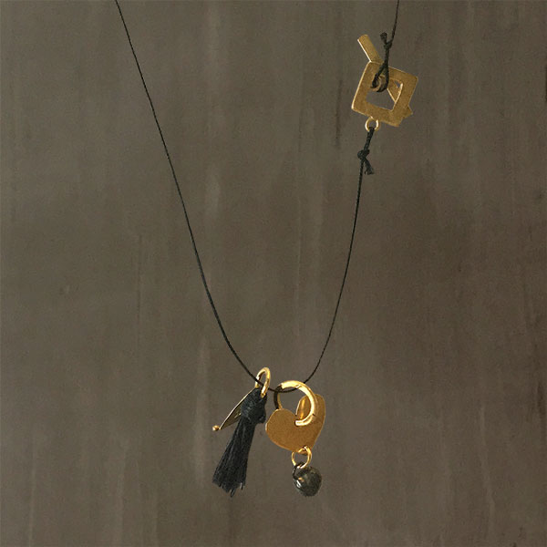 Small hammered Bronze heart with a 24K Gold plated finish and a Black silk tassel hang from a thin Black waxed cord which secures with a 24K Gold plated bronze toggle closure.