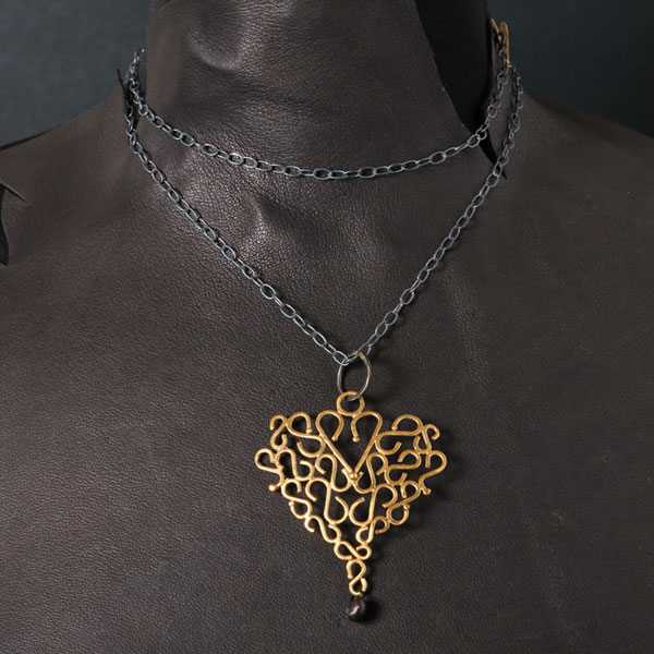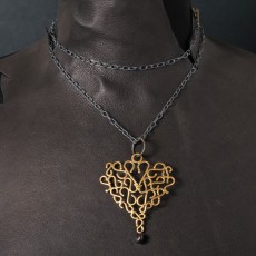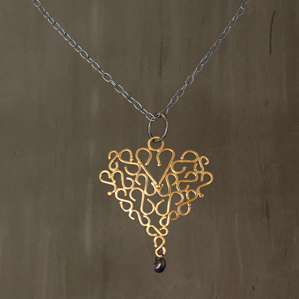 The Sweetheart pendant features a filigree design handcrafted with 24K Gold plated Bronze. Detailed with a Black Rhodium plated Bronze bead.