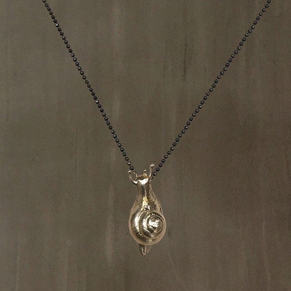 A slender and delicate handcrafted 925 Sterling Silver snail pendant is suspended from a Black Rhodium plated 925 Sterling Silver chain.