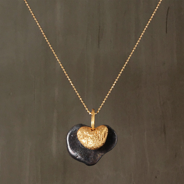 Two separate heart-shaped pebbles are casted in Bronze from original beach pebbles. The larger pebble is Black Rhodium plated. On top lays a smaller 24K Gold plated pebble.